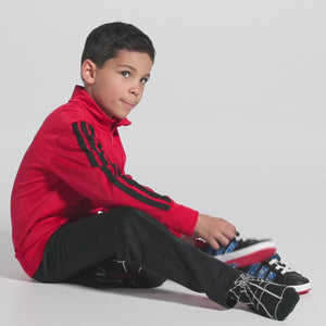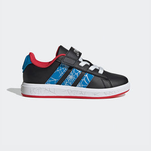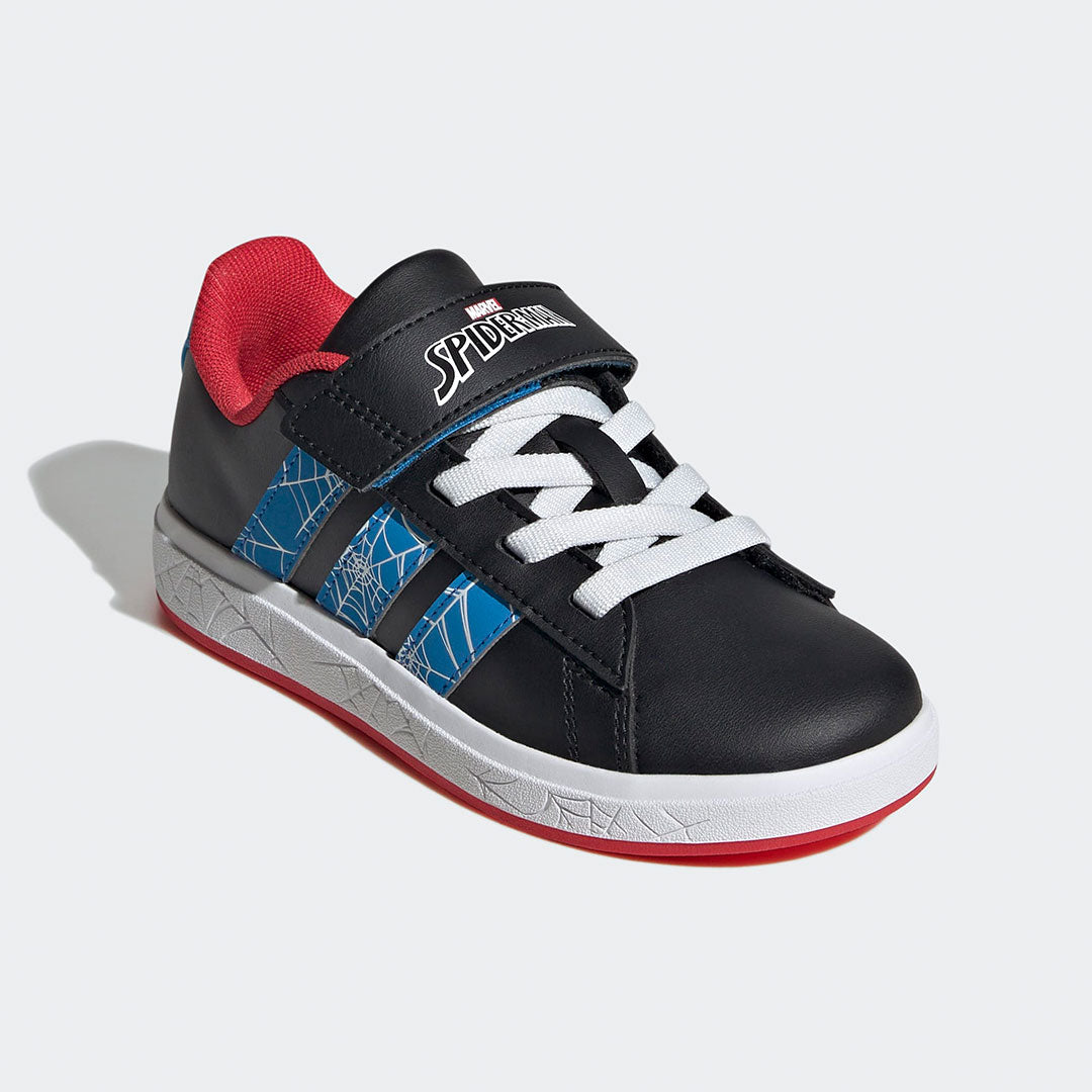 A los niños apasionados por la aventura les encantarán estos tenis Spider-Man de adidas. El estilo adidas GRAND COURT se ha reimaginado en los colores clásicos del cómic, con un diseño de Spider-Man en el lateral y un talón en 3D. Los cordones elásticos y la correa facilitan su colocación para que los niños puedan entrar en acción en cualquier momento.