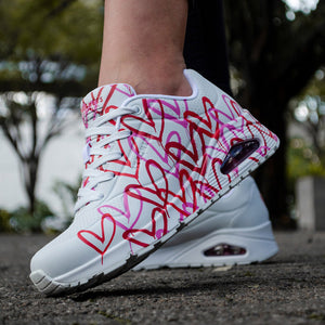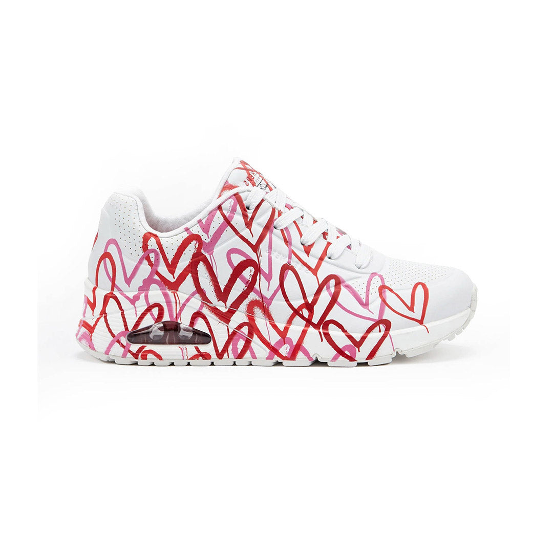 Uno - Spread the Love. Esta zapatilla a la moda con cordones presenta un estampado completo del diseño de corazón característico del artista que se extiende hasta la suela exterior durabuck sintético y parte superior perforada recortada con una plantilla Skechers Air-Cooled Memory Foam® y una cuña de plataforma con aire visible Skech-Air®. -entresuela acolchada.