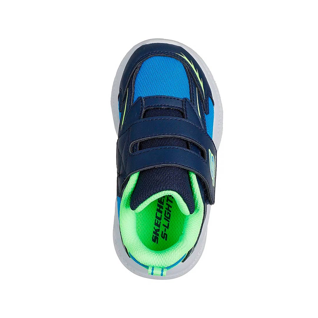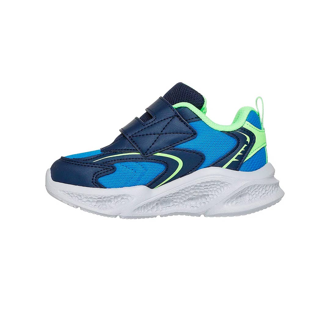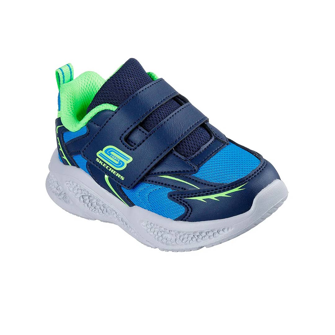 Los chicos pueden brillar con estilo y comodidad con las zapatillas Skechers Meteor-Lights. Estas zapatillas deportivas cuentan con un diseño de malla y cuero sintético en negro con detalles en azul. Además, tienen luces LED en la parte del talón que se iluminan con cada paso, lo que las hace perfectas para cualquier aventura.