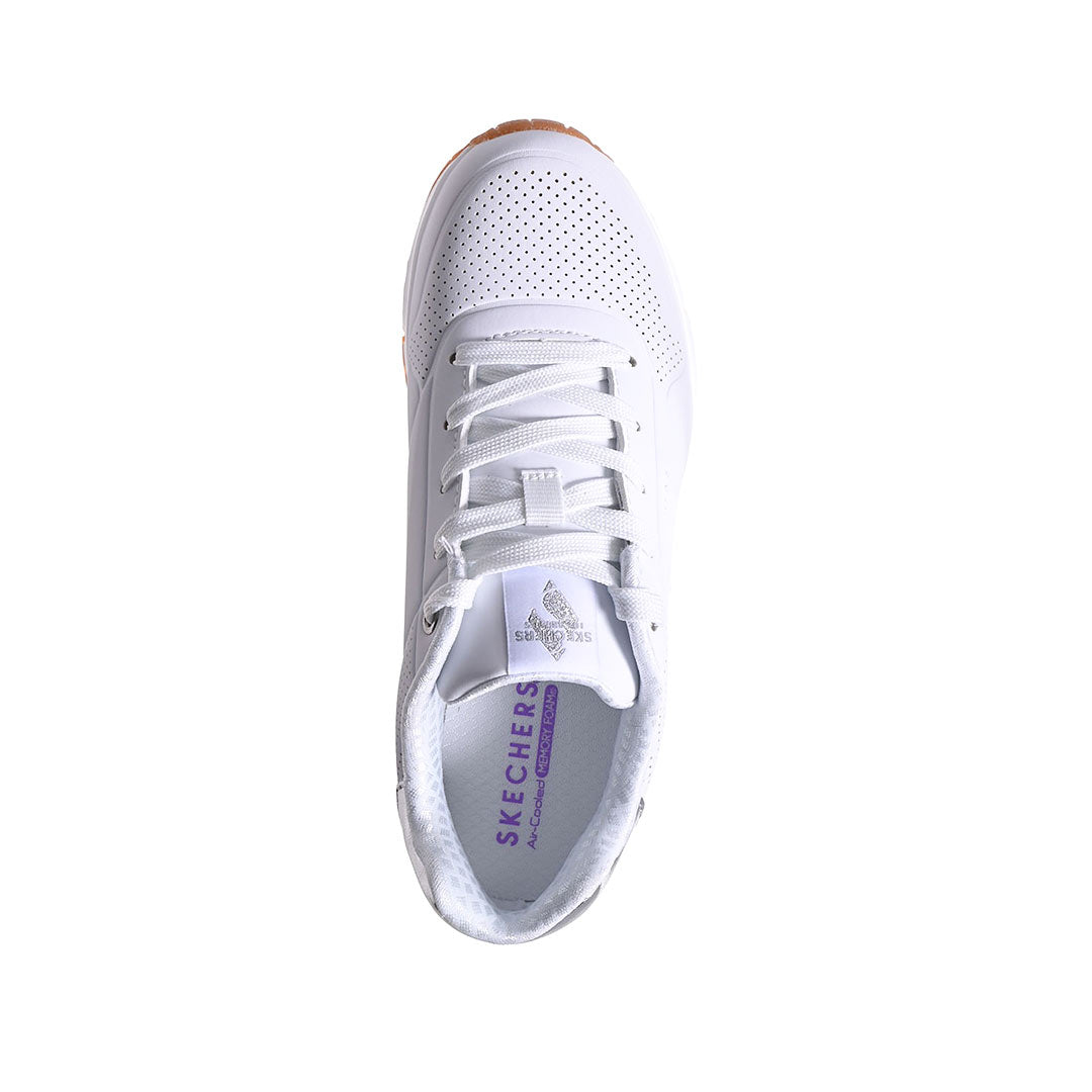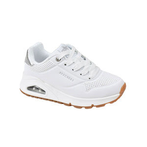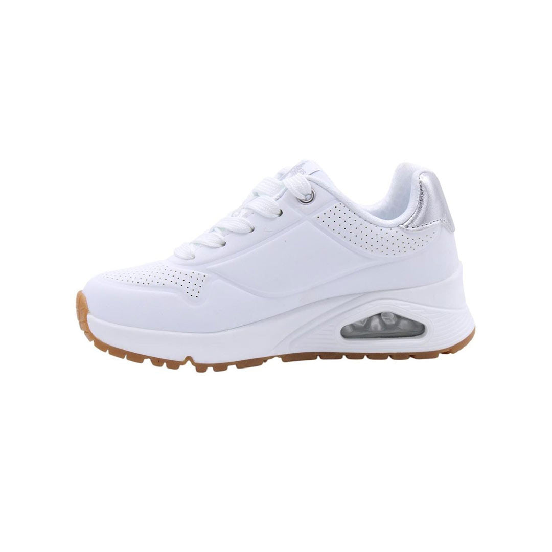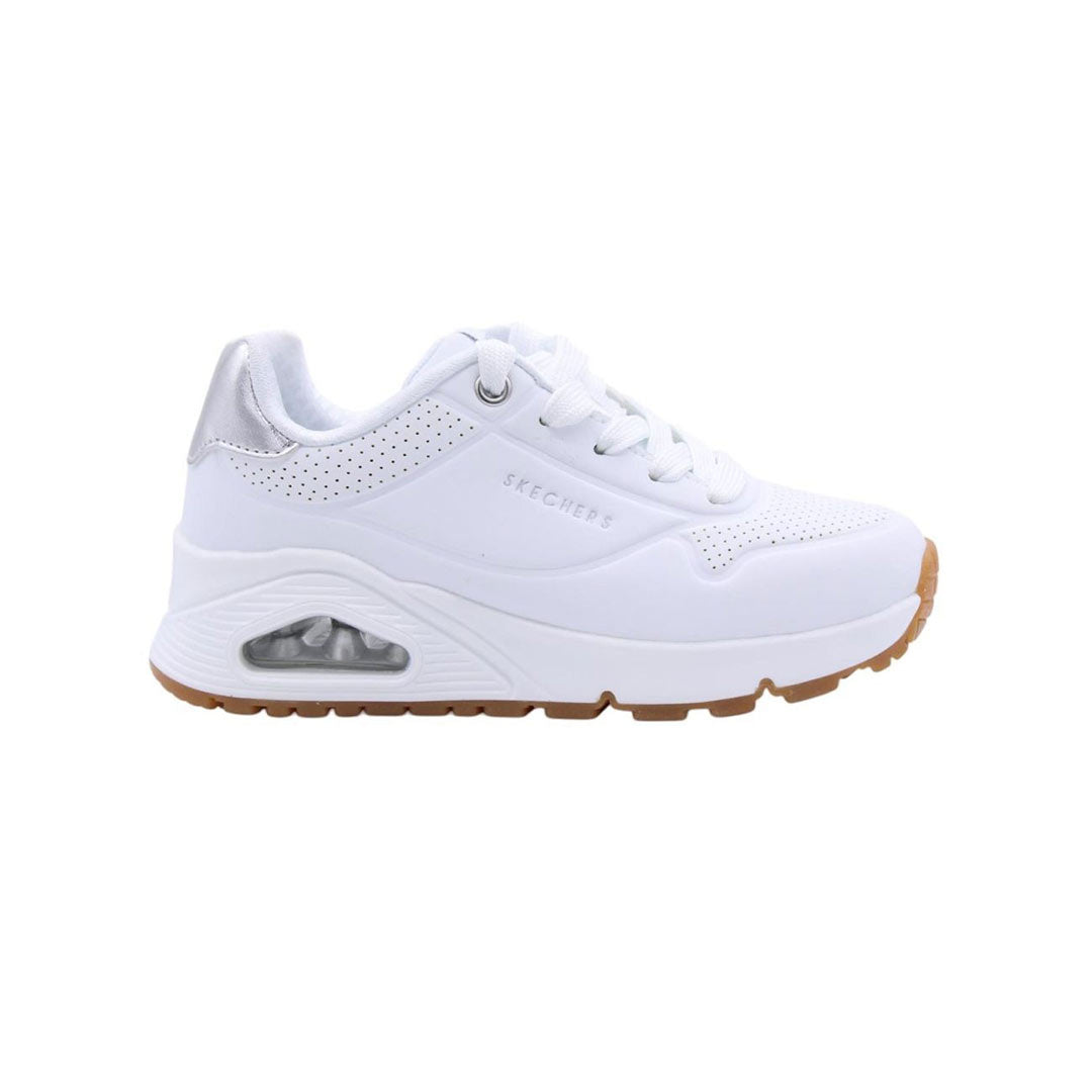 Mejora tu estilo deportivo con la comodidad y amortiguación de Skechers Street™ Uno Gen1 - Shimmer Away. Esta zapatilla deportiva de moda con cordones presenta una parte superior de cuero sintético con ribete metálico, una plantilla cómoda Skechers Air-Cooled Memory Foam® y una entresuela con airbag Skech-Air® visible.