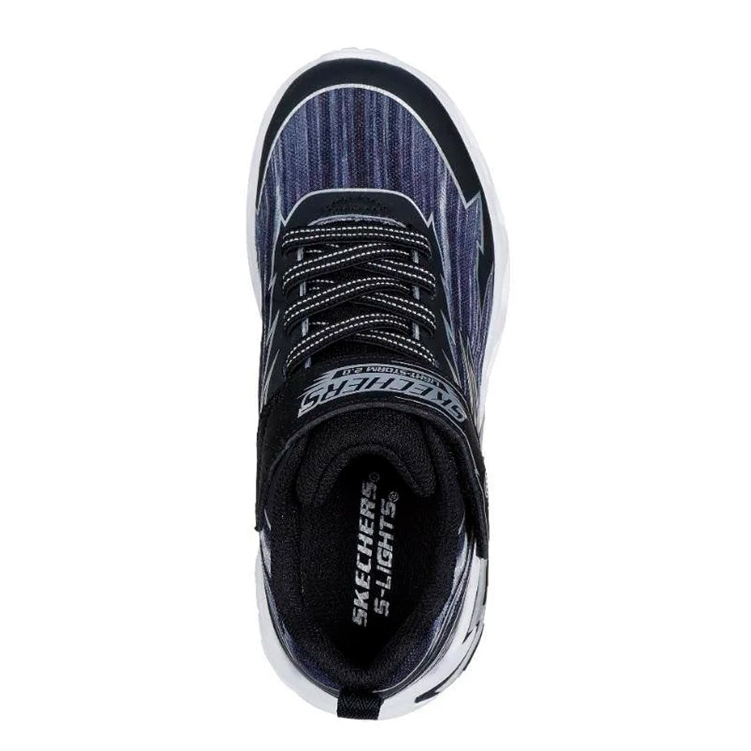 Dale caña a la diversión con Skechers S-Lights®: Light Storm 2.0 - Bolt-Brights. Estas zapatillas con temática de rayos cuentan con una parte superior de malla y material sintético con tecnología Storm, cierre adaptable de Skechers, cordones elásticos y una entresuela iluminada que absorbe los impactos.